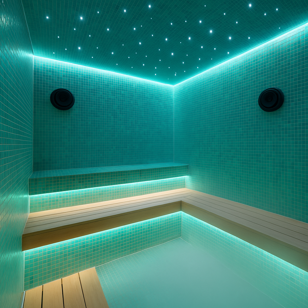 Duvar dipleri, sedir kenarları ve tavan çevresine gömülen RGB LED şeritler ile ince fiber optik kabloların oluşturduğu “yıldız tavan”, 16 milyon renk ve gerçekçi gece gökyüzü efekti sunarken; paslanmaz çelik difüzör ve su geçirmez konektörler uzun ömür garantisi verir.